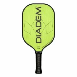 The Diadem Wave is perfectly balanced and easy to swing. The paddle design allows you to be able to enjoy the game of pickleball right away. The Diadem Wave is available in two colors of teal, or the electric yellow. The Wave paddle uses HMT Fiber, a blend of hot melt glass fiber to give power to your baseline strokes and put away as well as a rough surface to get added spin. The thick bumper (edge guard) prevents any scratches to the paddle surface as you learn the dos and don’ts of the game. A .55in/12mm thickness with an 8mm honeycomb cell interior structure mimics our high-end Icon paddles for added power. Start your path towards being a pickleball champion with the Diadem Wave!
